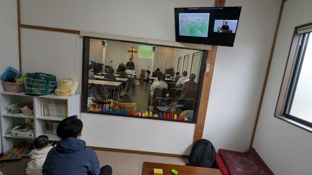 礼拝堂で投影しているスライドなどの映像は、キッズルーム内のモニタでもご覧いただけます。